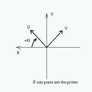 The U-V-Z coordinates used in MOFIA are derived from the X-Y-Z coordinates like this: the X axis becomes the U axis and the Y axis becomes the V axis after a rotation around the Z axis by +45 degrees.